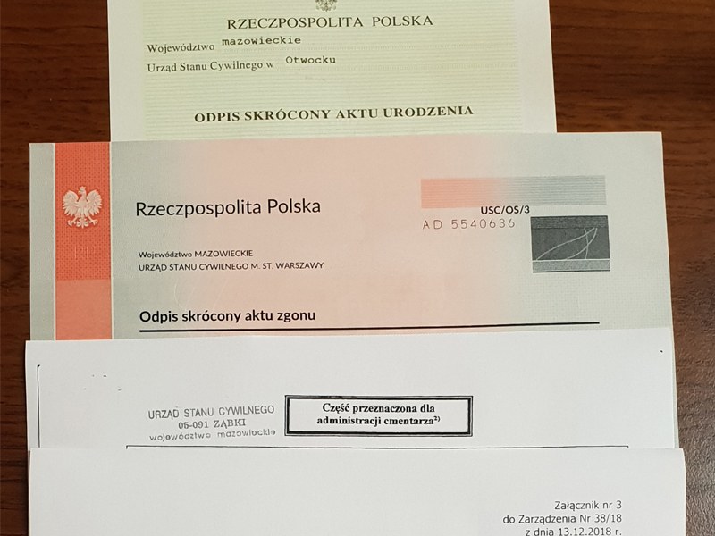 WAŻNE: wydanie jednego odpisu aktu zgonu jest bezpłatne, za kolejne trzeba uiścić opłatę skarbową w wysokości 22 zł za sztukę.